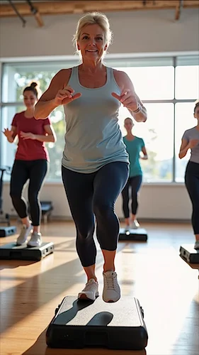Enjoy energizing step aerobics combined with strength training using light weights or resistance bands. Improve your cardiovascular health, build muscle and tendons strength.
